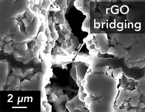 Athanasiou與布朗大學的工程學教授Brian Sheldon和NitinPadture一起工作,他們多年來一直使用納米材料增韌航空航天工業用陶瓷。在這項工作中,研究人員制造了氧化石墨烯的微小片晶,將其與一種叫做LATP的陶瓷粉末混合,然后將混合物加熱以形成一種陶瓷-石墨烯復合材料。